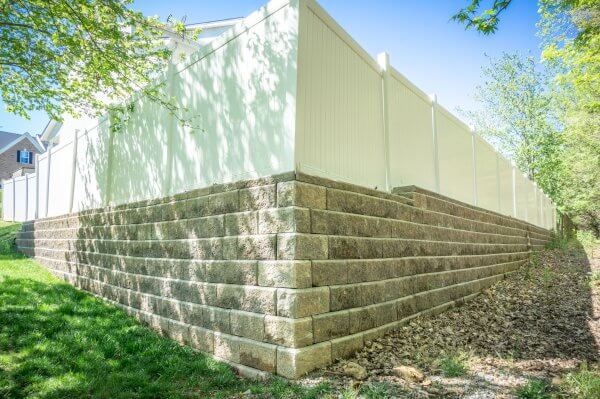 This property had a custom retaining wall, fence, walkway, and patio installation